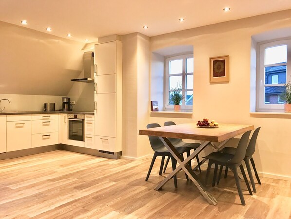 Die frisch renovierte, sehr helle, 70 m2 große Wohnung hat neben einer modernen, offenen Einbauküche (Spülmaschine, Kühl- und Gefrierschrank, Ceranfeld mit 4 Kochstellen & Backofen), einen kleinen Abstellraum mit Waschmaschine. Das Badezimmer, ausgestattet mit Dusche, WC und Handtuchtrockner liegen im oberen Bereich der Wohnung. Bei Bedarf besteht die Möglichkeit, ein Kind im Schlafzimmer unterzubringen (Matratze). Zudem verfügt die Wohnung noch über ein Gäste WC, sowie einem Balkon mit Doppeltür. Der große Esstisch eignet sich auch als Arbeitsbereich, kostenloses WLan ist vorhanden, bei Bedarf kann ein Drucker geliehen werden. Der Fernseher im Wohnbereich verfügt über Internet. Die gesamte Wohnung ist mit Fußbodenheizung ausgestattet.