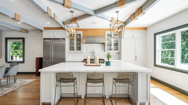 Inside, sunlight fills the open floor plan, highlighting thoughtfully curated furniture and dcor. The living room invites conversation or movie nights, while the chefs kitchen boasts top-of-the-line appliances and a wine fridge. Indoor and outdoor dining tables each seat 10. A private second-floor office, high-speed Wi-Fi, central AC, and washer/dryer ensure comfort and convenience.