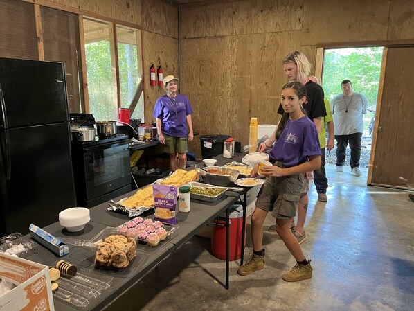 Guests can enjoy hiking, swimming in the creek, relaxing in the common area, lying in a hammock, or quiet time in their own personal cabin. We provide cornhole boards and bags, basketball goal, volleyball court, dart board, and other board games for guests. Our common area is available for all guests and includes a large dining area with tables and chairs. Other amenities include a large kitchen/cooking area with refrigerators, freezers, microwaves, ovens, and coffee makers. Vending and ice machines are also available with washer, dryer and dishwasher with dishwashing sink.