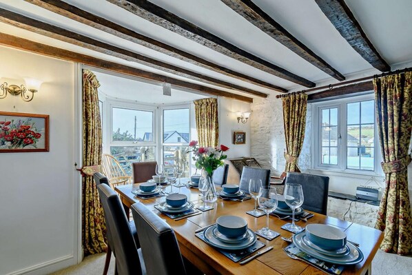 Inside, the cottage features a spacious dining room with sea views and feature stone walls leading into the lounge area, where a cast iron multi-fuel burner adds a cosy touch. The lounge is furnished with two three-seater leather sofas, a two-seater sofa, and a Smart TV for enjoyable evenings in. The kitchen retains all the charm of a traditional cottage, and there’s an adjacent breakfast room, perfect for savouring your morning coffee. Completing the ground floor is a convenient shower room. Heading upstairs, you’ll discover four bedrooms. The master bedroom boasts a king-size bed, sea views, and an original feature fireplace. Two additional double rooms provide comfortable accommodation, with one enjoying sea views too. There is also another bedroom that has two single beds. The family bathroom completes the cottage’s interior. To the side of the property, there’s an enclosed courtyard garden that offers views of the sea and provides an outdoor seating area, making it an ideal spot to unwind and take in the coastal atmosphere.