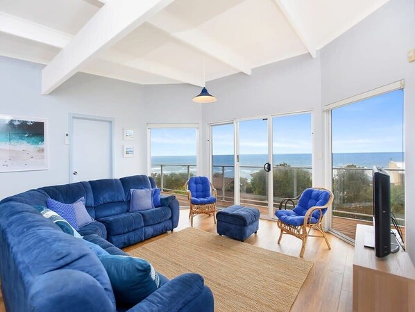 Das Wohnzimmer im Obergeschoss verfügt über eine große, modulare Couch, auf der Sie die Aussicht genießen oder nachts auf dem großen LCD-Fernseher fernsehen können. Die Aussicht von oben ist fantastisch, Aussicht vom Bluff nach Goolwa.