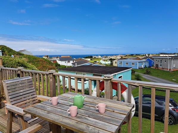 Ein traditionelles 2-Bett-Strandchalet in zentraler Lage an einer flach abfallenden Grasböschung mit Meerblick und nur wenige Gehminuten vom Strand entfernt. Parken Sie direkt vor dem Haus mit Stufen, die zur Haustür führen.