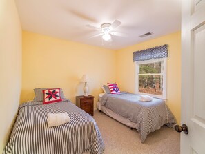 Upstairs is where a queen bedroom and twin bedroom are found. There is a shared bathroom with a shower/tub combination, too. Being on the front of the house, the downstairs queen bedroom receives lots of natural light. This room has a big screen television and an oversized bathroom with a shower/tub combination.