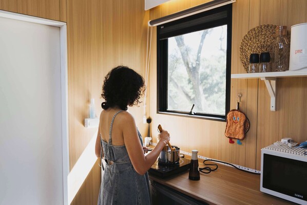 A comfortable 139-square-foot tiny home with easy access to water, split air conditioning, a kitchenette, cooking equipment, and excellent bathroom facilities. These amenities include a flush toilet, hand basin, and shower (gas-heated for hot showers).