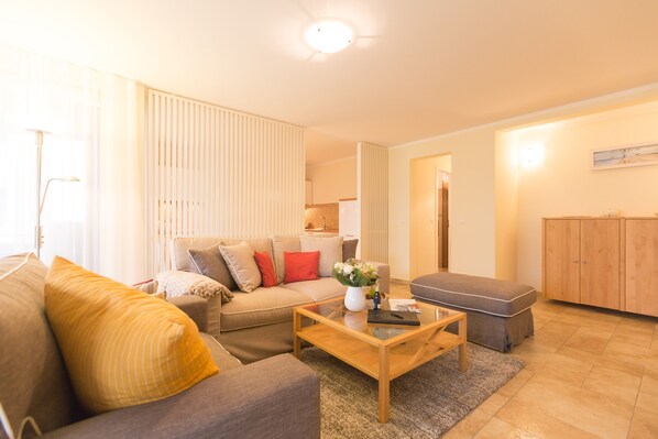 Nicht nur das klassische, hochwertige Interieur des Appartements, sondern auch die Ausstattung dieses Domizils werden Sie überzeugen. Das 3-Raum-Appartement im Hochparterre des Hauses bietet Ihnen mit seinen 75 qm komfortablen Platz für 3 Personen und 1 Kleinkind bis 3 Jahre. Auf Wunsch stellen wir für unsere kleinen Gäste ein Kinderreisebett (ohne zusätzliche Matratze [&] Bettzeug) und einen Kinderhochstuhl zur Verfügung. Für Ihren Komfort sind die Betten bei der Anreise bezogen und Handtücher liegen bereit. Der Wohnraum ist großzügig geschnitten und erstrahlt in hellen Farben. Der Essbereich und die Küchenzeile wurden durch eine offene Holzkonstruktion gekonnt vom Wohnbereich separiert. Vom Wohnzimmer gelangen Sie auf Ihre ca. 30 qm große Terrasse, die zur Südseite ausgerichtet ist. In diesem Domizil finden Sie zwei Schlafbereiche. Ein Schlafbereich ist mit einem komfortablen Doppelbett und der zweite Schlafbereich mit einer Schlafcouch (1.40m x 2.00m) ausgestattet. Zur Wohnung gehört ein PKW-Stellplatz in der Tiefgarage, außerdem gibt es eine Waschmaschine in der Wohnung. Das WLAN-Netz kann kostenfrei genutzt werden. Für den Tag am Meer steht Ihnen als besonderes Bonbon von Mitte Mai bis Ende September (je nach Witterung) ein Strandkorb am Strand kostenlos zur Verfügung.