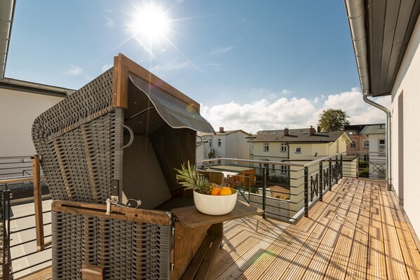 Herzlich Willkommen, über den Dächern von Ahlbeck. Auf der 42 Quadratmeter großen und umlaufenden Dachterrasse (OST/SÜD/WEST) werden Urlaubsträume wahr. In diesem stylischen, 66 Quadratmeter großen Penthouse ist nichts von der Stange. Die Möbel wurden von einem Metalldesigner und einer Tischlerei Manufaktur eigens dafür angefertigt. Filigrane Möbel handgefertigt aus Stahl, ebenso die Schränke und Regale mit Oberflächen aus echtem Beton, überzeugen durch haptische Eindrücke und durch Leichtigkeit auf einem neuen Level. In diesem Drei-Zimmer-Appartement können bis zu vier Personen eine besonders schöne und ruhige Auszeit genießen und sich rundum entspannen. Einfach in den XL-Strandkorb (Volllieger) fallen lassen und schon sind sie mittendrin im Ostseeurlaub. Auch ihren geliebten Vierbeiner dürfen sie hier sehr gerne mitbringen. In einem der beiden Schlafzimmer steht sogar ein Hundebett für Ihre Fellnase bereit. Ein Fahrstuhl bringt sie von der Tiefgarage bis direkt unters Dach. Treten sie ein in einen offenen und wunderschön eingerichteten Wohnbereich mit großer Wohnlandschaft, bequemen Sessel, Flat-TV und noblen Essplatz. Die hohen Räume und die offene Raumarchitektur erfrischen bereits beim Eintreten in die Suite. In diesem Quartier trifft Kunst auf Design und Gemütlichkeit auf erlesene Materialien. Vom Echtholzparkett aus Eiche, über dimmbare Leuchten von FIBIA, bis hin zu funkelnden Drahtglas-Accessoires alles ist aufeinander abgestimmt und vermittelt ein besonderes Urlaubsgefühl. Kalten Füßen können sie ade sagen, denn das Appartement ist mit einer Wohlfühl-Fußbodenheizung ausgestattet. Zudem verfügt ihr Feriendomizil im Wohn-/Essbereich über eine Klimaanlage. Das WLAN können sie kostenfrei benutzen. Die im offenen Wohnzimmer integrierte Küche ist mit Markengeräten wie Backofen mit Mikrowelle, Geschirrspüler und einem Induktionskochfeld sowie erlesenem Geschirr und Besteck bestens ausgestattet. Im geräumigen Gefrier-Kühlschrank finden viele Lebensmittel und Getränke Platz. Zwei Schlafzimmer mit bequemen Doppelbetten (1,60 m x 2,00 m), Flat-TV, angefertigten Einbauschränken und zwei Duschbäder bieten für jeden ein persönliches Rückzugsreich. Von den beiden Schlafzimmern aus haben sie Zugang zum umlaufenden Balkon. Die beiden Dornbracht/Duravit Bäder besitzen je eine bodengleiche Dusche, einen Waschplatz und ein Toto Tornado-Flush WC. Für kühle Abende bietet eines der Bäder, mit einer Finnischen Sauna, eine eigene Wellness-Oase. Bei Ihrer Anreise liegen Handtücher für sie bereit. Auch die Betten sind dann bereits bezogen. In der Tiefgarage sind für das Appartement zwei Parkplätze reserviert.