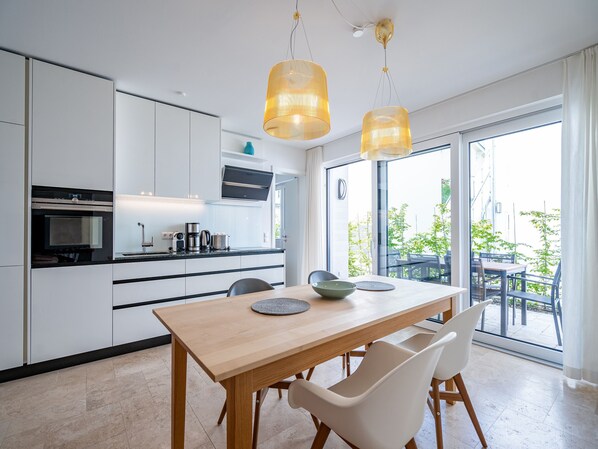 Zu ebener Erde gelegen und mit zwei wunderschönen Sonnen-Terrassen ausgestattet, ist das Appartement Nummer 01 mit seinen 79 Quadratmetern ein ideales Urlaubsdomizil für alle Ostseeliebhaber, die Wert auf Komfort und eine entspannte Atmosphäre legen. Bis zu vier Personen kann das aus drei Zimmern bestehende Wohlfühlreich aufnehmen. Alle drei Räume sowie die beiden Bäder wurden mit viel Liebe und einem Händchen fürs Dekor eingerichtet. Das große, offene Wohn-Esszimmer besitzt bodentiefe Fenster. Das sorgt für eine lichte und leichte Atmosphäre. Die gemütliche Sitzgruppe aus Sofa und Sesseln lädt zum Runterkommen und Entspannen ein. Highlight und Eyecatcher ist der Echtholz-Kamin. Wenn es draußen stürmt und ungemütlich wird, wird es hier drinnen, dank der knisternden Flammen, gemütlich und romantisch. Ein großer Flat-TV beschert das kuschelige Heimkino-Gefühl. Ein schöner Esstisch bietet Platz zum Schlemmen und Beisammensitzen. Von hier aus gehts hinaus auf die Süd-West-Terrasse (ca. 14 Quadratmeter). Mit Gartenmöbeln bestückt, können Sie bis in die späten Nachmittagsstunden hinein die Sonne genießen. An das Wohnzimmer angeschlossen ist eine offene, moderne Küche. Ob Herd, Geschirrspüler oder Kaffeemaschine sämtliche Geräte sind hochwertig und auf dem neuesten Stand. Ein komplettes Geschirr-Set finden Sie in den Schränken. Beide Schlafzimmer verfügen über Doppelbetten (1,80 m x 2,00 m) und einen geräumigen Schrank mit einem kleinen Schreibtisch ( eines mit Flat-TV). Aus einem der Schlafzimmer haben Sie Zugang zu einer zweiten Nord-West-Terrasse mit Gartenmöbeln (ca. 18 Quadratmeter). Die Bäder sind modern, verfügen über Dusche, Waschtisch und WC. Zudem haben beide Bäder Tageslicht. Freuen Sie sich auf kühle Tage oder Abende. Denn dann lädt die wohnungseigene finnische Sauna zum Schwitzen und Relaxen ein. Handtücher liegen bei Anreise bereit. Und auch die Betten sind bezogen. Das WLAN ist kostenfrei. In der Tiefgarage ist der Stellplatz Nummer 1 für Ihr Auto reserviert.