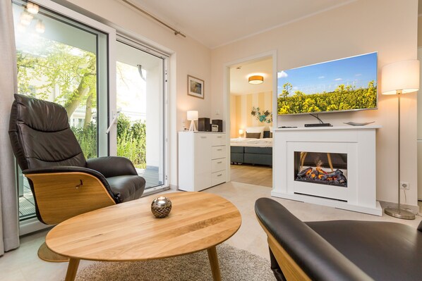 Modern wohnen - schöner Urlauben! Im neuen 3-Raum-Appartement 6 (67 qm) im Erdgeschoss der Dünenresidenz werden Sie erholsame Urlaubstage verleben. Bis zu 4 Personen und ein Kleinkind (als Aufbettung im Babyreisebett) finden hier Platz. Die geschmackvolle Einrichtung, abgestimmte Farben und Materialen und ausgesuchte Dekorationen schaffen ein wunderschönes Urlaubsdomizil. Schon beim Eintreten öffnet sich der helle Wohnbereich mit bequemer Sitzgruppe, Elektro-Kamin mit Fernbedienung und Flat-TV, die komplett ausgestattete Küchenzeile und der Essbereich schließen sich an. Zwei Schlafzimmer mit komfortablen Doppelboxspringbetten (1,80 m x 2,00 m und 1,60 m x 2,00 m) und eigenem Flat-TV sowie zwei Bäder mit Dusche und WC und einer Waschmaschine ergänzen die Wohnung. Selbstverständlich darf die wohnungseigene Sauna nicht fehlen! Ein weiteres Highlight des Appartements ist die großzügige Nord-Ost-Terrasse mit Gartenmöbeln (Zugang vom Wohnbereich und von einem Schlafzimmer). Bevor der Strand lockt, genießt man bei Meeresrauschen hier sein Frühstück in der Morgensonne. Für Ihren Komfort sind bei der Anreise die Betten bezogen und die Erstausstattung Handtücher liegt bereit. Das kostenfreie WLAN steht Ihnen zur Verfügung. Ein Pkw-Stellplatz befindet sich in der Tiefgarage (max. Einfahrtshöhe 1,85 m) und für Fahrräder gibt es einen separaten Abstellraum im Keller. ***Aktueller Hinweis - Stand 12.2025: Auf dem linken Nachbargrundstück (1. Reihe an der Promenade) starten im Dezember 2025 die Bauarbeiten für ein neues Appartementhaus. Während dieser Zeit ist mit den üblichen Beeinträchtigungen einer Baustelle zu rechnen. Die Fertigstellung ist im Jahr 2027 geplant. Diese Wohnung liegt auf der baustellenabgewandten Seite.*** Ein Domizil für Anspruchsvolle und Genießer! Freuen Sie sich auf ein wunderschönes Urlaubsdomizil, denn die Dünenresidenz Heringsdorf verbindet den zeitgemäßen Komfort eines Neubaus mit einer strandnahen Lage. Eine Tiefgarage (max. Einfahrtshöhe 1,85 m) und ein Aufzug im Haus sind hier selbstverständlich. Helle, geschmackvoll designte 2- und 3-Raum-Appartements mit Balkonen oder Terrassen laden zum Erholen ein. Die Dachgeschosswohnungen überzeugen mit großzügigen Dachterrassen und schönen Ausblicken. Aus einigen Wohnungen kann man sogar durch die Dünenbepflanzung das Meer schimmern sehen. Als besonderes Highlight verfügen die Wohnungen über eine Sauna und/oder einen Elektrokamin, der per Knopfdruck Gemütlichkeit zaubert. Außerdem sind alle Appartements mit Fußbodenheizung und elektrische Rollläden ausgestattet.