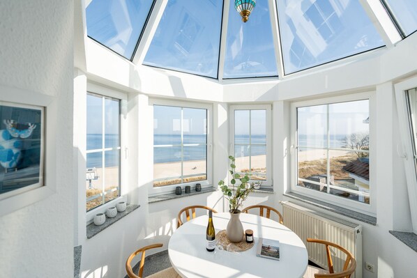 Genießen Sie den einzigartigen Ausblick auf das Meer aus unserer stilvoll und modern eingerichteten 3-Raum-Ferienwohnung in der Dünenresidenz. Die 75 m² große Dachgeschosswohnung bietet höchsten Komfort und ist bequem mit dem Aufzug erreichbar. Zwei gemütliche Schlafzimmer mit Doppelbetten ( Boxspringbett 1,60m x 2,00m / Doppelbett 1,80m x 2,00m), ein modernes Duschbad sowie eine voll ausgestattete Küche lassen keine Wünsche offen. Der lichtdurchflutete Essbereich im Glasturm schafft eine besondere Atmosphäre hier speisen Sie mit direktem Blick auf die Wellen. Der großzügige Wohnbereich öffnet sich zu einem Balkon, von dem aus Sie den Blick auf den Schloonsee und auch das Rauschen des Meeres genießen können. Die Wohnung bietet Platz für bis zu 4 Personen sowie ein Kleinkind bis 3 Jahre im Kinderreisebett. Auf Wunsch stellen wir Ihnen gern ein Kinderreisebett (ohne zusätzliche Matratze [&] Bettzeug) sowie einen Kinderhochstuhl (gegen Aufpreis) zur Verfügung. Für Ihren PKW steht Ihnen ein fester Stellplatz in der Tiefgarage zur Verfügung. Erleben Sie Erholung pur mit grandiosem Meerblick ein erholsamer Aufenthalt erwartet Sie!