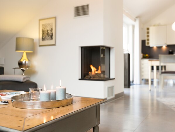 Voilà - ganz oben unter dem Dach des Vorderhauses erwartet Sie nicht nur ein schöner Blick auf die Ostsee, sondern auch eine perfekt gestylte, luxuriöse 2-Raum-Ferienwohnung auf großzügigen 75 qm (buchbar für 2 Personen [&] 1 Kleinkind bis 3 Jahre im Kinderreisebett). Wunderschöne französische Möbel aus der Manufaktur Grange und aparte Stoffe von Joop, kombiniert mit modernem Design ergeben hier ein harmonisches Ambiente zum Wohlfühlen. Schon beim Eintreten in den Flurbereich offeriert sich Ihnen ein großer Wohnbereich mit angrenzender offener Küche und Essplatz, von dem man über den Balkon auf das Meer schaut. Auf diesem uneinsehbaren Balkon steht Ihnen neben Gartenmöbeln auch ein komfortabler XXL-Strandkorb (Volllieger) zur Verfügung. Das gemütliche Flair der bequemen Ledergarnitur im Wohnbereich wird durch Loewe-Flat und Blue-Ray-Player komplettiert. Ein besonderes Highlight ist der Gaskamin, der per Fernbedienung mühelos zu bedienen ist. Ein harmonisches Schlafzimmer (absolut[nbsp] abdunkelbar) mit Doppelbett (1,80m x 2,00m), Loewe-Flat und Einbauschrank, ein exponiertes Dornbracht Bad mit großer ebenerdiger Echtglasdusche, puristischen Formen beim Waschtisch und WC, sowie ein kleiner sonniger Südwestbalkon vervollkommnen das Domizil. Für Ihren Komfort sind die Betten bei der Anreise bezogen und Handtücher liegen bereit. Ein Pkw-Stellplatz steht in der Tiefgarage zur Verfügung. Eine Waschmaschine in der Wohnung ist gegen Gebühr nutzbar. Auf Wunsch stellen wir ein Kinderreisebett ( ohne zusätzliche Matratze [&] Bettzeug) und einen Kinderhochstuhl gegen einen Aufpreis zur Verfügung. Das WLAN-Netz ist kostenfrei nutzbar. Ganz neu: Vital [&] köstlich bieten wir Ihnen exklusiv in diesem Appartement belebtes GRANDER Trinkwasser für mehr Lebensenergie und gesteigertes Wohlbefinden an.