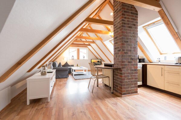 Klein, aber fein und ganz gemütlich unter dem Dach - die helle, freundliche Ferienwohnung im Dachgeschoss der Villa ist 45 qm groß. Baulich bedingt müssen größer gewachsene Gäste im Flurbereich ihren Kopf kurz einziehen weil die ursprüngliche Balkenlage im Dachgeschoss erhalten wurde. Modern, komfortabel und geschmackvoll eingerichtet, bietet es zwei Personen und einem Kleinkind (bis 3 Jahre) Platz zum Wohlfühlen. Das Appartement verfügt über ein Wohnzimmer mit Küchenzeile, ein Schlafzimmer mit Doppelbett und ein Bad mit Dusche und WC. Auf Wunsch stellen wir für unsere kleinen Gäste ein Kinderreisebett (ohne zusätzliche Matratze [&] Bettzeug) und einen Kinderhochstuhl (gegen einen Aufpreis) zur Verfügung.