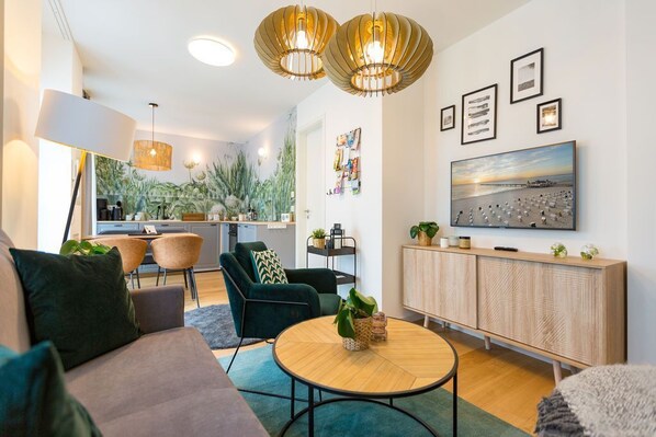 Natur-Design mit außergewöhnlichem Charme Das Appartement 12 verführt designaffine Ostseeliebhaber mit unvergleichlich schönem Ambiente. Auf den zwei Etagen des 64 Quadratmeter großen Studios können bis zu vier Personen und ein Kleinkind (im Kinderreisebett) einen erholsamen Urlaub erleben. Von der Tapete, über das Mobiliar bis zum Lichtdesign hier ist alles bis ins Kleinste durchdacht. Vorbild für die renommierte Innenarchitektin war die Natur mit ihrer vielfältigen Flora. Überall ist die Pflanzenwelt daher in dem kleinen Studio anzutreffen. Warm und natürlich, stilvoll und elegant verleiht das Interieur dem Appartement mit vielen Naturmaterialien einen besonderen Charme. Das Wohn-Esszimmer mit offener Küche ist geräumig. Hochwertige Geräte sorgen für Arbeitserleichterung. Die Sofalandschaft mit Stahlrohrrahmensessel ist eine gemütliche Wohlfühloase. Ihr ganz persönlicher Rückzugsort. Der Flat-TV wird zum Heimkino. Vor den bodentiefen Fenstern erstreckt sich eine Sonnenterrasse. Genießen Sie dort in der Morgensonne Ihr Frühstück. Ins Schwitzen wird Sie ganz sicher das moderne Bad mit Dusche und WC im Erdgeschoss bringen. Hier können Sie in der Finnischen Sauna entspannen. Eine Treppe höher warten zwei gemütliche und komfortable Schlafzimmer auf Auszeitsehnsüchtige. Auch in Ihnen ist die Handschrift der Designerin durchweg wiederzufinden. Naturmaterialien und warme Farben sorgen im ersten Schlafzimmer für eine ausgeglichene Harmonie. Bütenverzaubert entführt Sie das zweite Schlafzimmer in erholsame Traumwelten. Jedes Zimmer verfügt über ein Doppelbett (1,60 m x 2,00 m), einen Flat-TV und genügend Ablageflächen für die Urlaubsgarderobe. Welcome to the jungle, ruft das Badezimmer im Obergeschoss mit seiner floralen Tapete, die bis an die Decke hinaufzuwachsen scheint. Um Handtücher brauchen Sie sich nicht zu kümmern. Sie liegen bereit. Ebenso sind bei Anreise die Betten bezogen. Für Ihr Auto ist in der Tiefgarage der Stellplatz 12 reserviert.