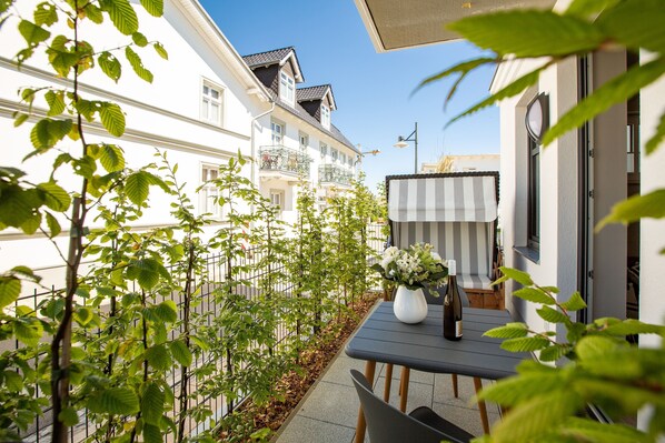 Mitten im Herzen von Ahlbeck sorgt dieses stylische Appartement für zwei Personen und ein Kleinkind (im Kinderreisebett) für viel Erholung und Entspannung. Das 46 Quadratmeter große Urlaubsparadies befindet sich im Erdgeschoss des Quartiers Frohsinn, hat eine kuschelig urige Terrasse und zwei Zimmer. Bringen Sie ihren geliebten Vierbeiner hier ruhig mit. Er oder sie ist herzlich willkommen. Das Innere des Appartements besticht mit schlichter Eleganz und ausgesuchten Design-Möbeln. Die Cassina-Reihe von Le Corbusier ist hier durchgehend vertreten. Selbst der berühmte LC1 mit Kuhfell fehlt nicht. Aber ganz gleich, ob Sofa oder bequemer Essplatz, Couchtisch oder die Kunst an der Wand das Appartement wurde mit viel Geschmack eingerichtet. Leder in Kombination mit Glas und Chrome verleihen Ihrem Wohlfühlreich ein besonderes Flair. Das Wohnzimmer verfügt zudem über einen Elektrokamin mit Fernbedienung und einen großen Flat-TV (50 Zoll) mit Blue-Ray-Player. Eine offene Küchenzeile ist mit allem Notwendigen ausgestattet. Die Küche enthält qualitativ hochwertige Geräte wie einen Induktionsherd, eine Mikrowelle, einen Geschirrspüler, eine Senseo Kaffeemaschine, gutes Kochgeschirr sowie ein edles Service. Das Wohnzimmer hat Zugang zur Terrasse (6 Quadratmeter), einer kleinen Rückzugsecke unter freiem Himmel mit Gartenmöbeln und Strandkorb. Das Schlafzimmer wartet mit einem komfortablen Boxspringdoppelbett (1,80 m x 2,00 m) auf. Der große Einbauschrank ist geräumig und bietet viel Ablagefläche. Das Bad ist mit Dusche und WC versehen. Das WLAN für Musik- und Internetgenuss ist kostenfrei. Handtücher und Bettwäsche sind inklusive und bereits vor Ort, wenn Sie anreisen. Im Keller befindet sich ein separater Fahrradraum. Ein Außenstellplatz gehört zur Ferienwohnung dazu. Das zeitgemäß erbaute Quartier Frohsinn besticht nicht nur durch seine zentrale und strandnahe ( 250 m) Lage im Seebad Ahlbeck, auch die moderne, geschmackvolle Einrichtung der 2- bis 4-Raum-Appartements wird Sie überzeugen. Das Haus verfügt über eine Tiefgarage und einen Aufzug. Bitte beachten Sie, dass sich neben der Annehmlichkeit des Fahrstuhls, auf den Wegen im öffentlichen Bereich und teilweise in den Wohnungen Stufen befinden (nicht barrierefrei). Für jede Wohnung steht im Haus ein PkW-Stellplatz in der Tiefgarage (außer App. 4 b ein Außenstellplatz) zur Verfügung. In wohnungseigenen Kellerräumen können Sie Ihre Fahrräder abstellen. Ebenso steht kostenfreies WLAN zur Verfügung.