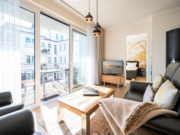 Ein stilvolles Appartement ist die Nummer 8 im ersten Obergeschoss. Für bis zu vier Personen bieten die 74 Quadratmeter viel Platz zum Entspannen und Genießen. Ein großer offener Wohnbereich mit hochwertig und voll ausgestatteter Küchenzeile ist der ideale Ort, um neue Energie zu tanken und mit der Familie oder mit Freunden eine wundervolle Zeit zu verbringen. Eine gemütliche Sofa-Sitz-Landschaft, ein großer Flat-TV, ein Kaminofen und ein schöner Esstisch mit Stühlen all das wird Ihre Ostseeauszeit verschönern. Vom Wohnzimmer aus können Sie auf den Balkon (10 Quadratmeter) mit Gartenmöbeln hinaustreten. Lassen Sie es sich hier bei einem erfrischenden Getränk oder einem feinen Essen gut gehen. In der Küche ist alles Nötige vorhanden: Induktionsherd, Geschirrspüler, Mikrowelle, Toaster, Kaffeemaschine, Wasserkocher, Töpfe, Pfannen und edles Porzellan. Das Appartement verfügt über zwei Schlafzimmer, die mit je einem bequemen Boxspringdoppelbett (1,80 m x 2,00 m) und einem geräumigen Kleiderschrank eingerichtet sind. Die bodentiefen Fenster lassen viel Licht in jeden der Räume. Auf das Badezimmer wird es sicher nie einen Ansturm geben, denn es gibt sogar zwei davon. Beide verfügen über Dusche, Föhn und WC. Das Masterbad hält noch eine kleine Überraschung bereit: Eine Finnische Sauna. Genießen Sie Ihre private Wellness-Oase. In einem separaten Hauswirtschaftsraum befindet sich zudem eine Waschmaschine. Handtücher und Bettbezüge gehören zum Preis dazu. Auch das WLAN ist inklusive. In der Tiefgarage gehört zur Wohnung der Stellplatz Nr. 8. Außerdem gibt es dort einen Fahrradraum.