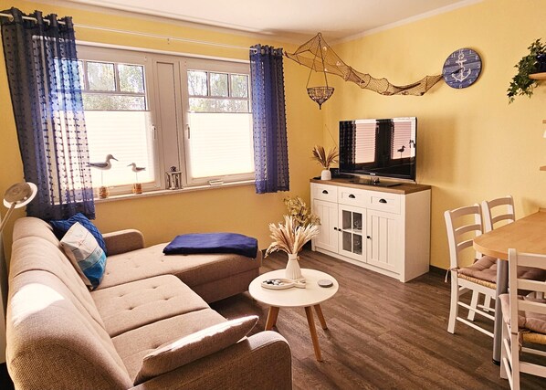 Die gemütliche maritime Ferienwohnung ist 32 qm und liegt im Erdgeschoß. Der kombinierte Wohnraum verfügt über eine gemütliche Couch, Couchtisch, Kabel-TV, Radio mit CD-Player, DVD-Player sowie eine Küchenzeile mit 4 Platten-Induktionsherd, Backofen, Spüle, Kühlschrank mit Gefrierfach, Kaffeemaschine, Toaster, Wasserkocher, Mikrowelle und einen Esstisch mit 3 Stühlen.