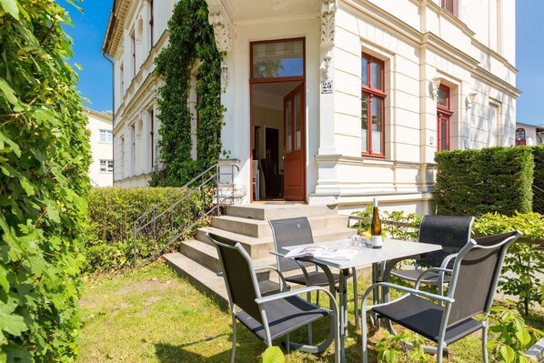 Diese traumhafte 3-Raum-Ferienwohnung begrüßt Sie Hochparterre im Kaiserbad Heringsdorf! Mit einer großzügigen Fläche von 60 qm bietet sie ausreichend Platz für bis zu 4 Personen und lädt zu einem unvergesslichen Urlaub ein. Das Wohnzimmer ist der perfekte Ort, um gemütliche Abende zu verbringen. Hier finden Sie eine bequeme Sitzgruppe und einen Fernseher, der zum Entspannen und Ausruhen einlädt. Die angrenzende Küchenzeile ist mit allem ausgestattet, was Sie zum Kochen und Zubereiten köstlicher Mahlzeiten benötigen. Ein Essplatz rundet das Wohnzimmer ab und schafft einen gemütlichen Raum für gemeinsame Mahlzeiten. Die Ferienwohnung verfügt über zwei Schlafzimmer, die Ihnen einen erholsamen Schlaf garantieren. Neben einem komfortablen Doppelbett im ersten Schlafzimmer, erwarten Sie im zweiten Schlafzimmer zwei Einzelbetten (0,90m x 2,00m). Egal ob Sie als Paar reisen oder mit Freunden, hier finden Sie den perfekten Rückzugsort. Das Badezimmer ist mit einer Dusche und einem WC ausgestattet. Darüber hinaus verfügt die Wohnung über eine kleine Terrasse, auf der Sie entspannte Momente im Freien verbringen können. Für Ihren Komfort sind die Betten bei Ihrer Anreise bereits bezogen und Handtücher liegen für Sie bereit (Erstausstattung). Darüber hinaus steht Ihnen unser kostenfreies WLAN-Netzwerk im gesamten Haus zur Verfügung. Ein weiteres Highlight ist der PKW-Stellplatz direkt am Haus.