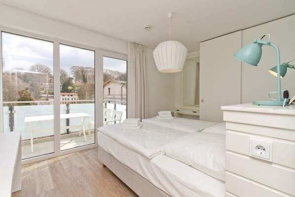 Ein schönes, großes und helles Wohn-Esszimmer ist das Zentrum dieser traumhaften Ferienwohnung im 2. Stock der Villa Bettina in Heringsdorf. Viel Weiß, ein Mint-Pastell an den Wänden und nordische Design-Möbel verleihen den 54 Quadratmetern Charme und Noblesse. Ein großer Holzesstisch ist der ideale Platz für gemeinsame Stunden. Ebenso die gemütliche Couch, von der aus Sie einen wunderbaren Blick auf das Flammenspiel im Kaminofen, den Flat-TV oder den Balkon haben. Lassen Sie sich schon beim Frühstück von der Morgensonne verwöhnen, die hier auf der Sonneninsel Usedom fast jeden Morgen zu einem sonnigen Start verhilft. Die offene Küche ist mit hochwertigen Gerätschaften und edlem Geschirr ausgestattet. Und schick ist die ausgesuchte Fliesenoptik obendrein. Wer sich im Urlaub himmlisch betten möchte, bekommt in diesem Feriendomizil in zwei schönen Schlafzimmern die Gelegenheit dazu. In den beiden Zimmern befinden sich je ein bequemes Boxspringdoppelbett (1,80 m x 2,00 m). Geräumige Schränke bieten viel Stauraum. Ein Schlafzimmer ist zudem mit einem Flat-TV ausgestattet. Dafür hat das andere Schlafzimmer einen Zugang zum Balkon. Das Duschen wird unter der ebenerdigen Regendusche im Badezimmer zum echten Genuss. Ein Waschtisch und ein WC gehören ebenfalls zur Ausstattung. Platz bietet das Appartement vier Personen und einem Kleinkind (im Kinderreisebett). Handtücher liegen bei Ankunft bereit. Außerdem sind die Betten bezogen. Die WLAN-Nutzung ist kostenfrei möglich. Für Ihr Auto steht am Haus ein Stellplatz zur Verfügung.