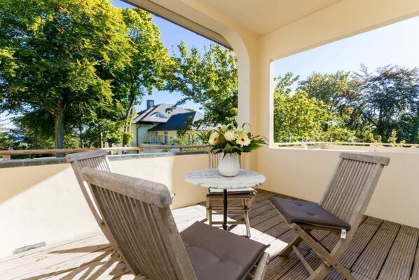 Moderner Lifestyle vom Feinsten: Erfrischend, pur, clean und entspannt macht das Interieur-Design dieses Ferienparadieses Freude und gibt ihm das gewisse Etwas. Hell und licht und mit viel Weiß lädt das Appartement 2 im Obergeschoss der Villa Diehl zum Ausspannen und Wohlfühlen ein. Bis zu 4 Personen haben in den großzügig geschnittenen 102 Quadratmetern dieser Wohnung jede Menge Platz. Ein wunderschöner Wohnbereich mit weiß gekälktem Echtholzdielenboden, flauschigem Hochflorteppich, einer stylischen Design-Sitzgruppe aus Sofa und Sesseln, dem gemütlichen Gas-Kamin und großem Flat-TV mit Blue-Ray-Player machen die Auszeit zu etwas Besonderem. Von hier aus geht es auf die sonnenüberflutete, offene Loggia mit Blick auf die begrünte Anlage hinaus. Lässt es sich schöner frühstücken als hier, wo die Ostsee sanft ins Ohr rauscht? Auch die beiden Schlafzimmer mit bequemen Doppelboxspringbetten und großen Schränken haben jeweils eigene Balkone. Die Küche ist mit hochwertigen Geräten voll ausgestattet. Nehmen Sie Platz am großen Esstisch und lassen Sie es sich schmecken. Highlight des geräumigen Badezimmers ist neben Waschtisch, WC und Echtglas-Dusche die kleine Infrarot-Sauna für zwei Personen. Hier wird es an kühlen Tagen und Abenden so richtig muschelig warm. Zur Wohnung gehört ein separates Gäste-WC. Damit Sie sich in Ihrem Urlaub wirklich um nichts kümmern müssen, liegen Handtücher für Sie bereit und die Betten sind bezogen. Sie haben im Appartement einen kostenfreien WLAN-Zugang. Auf dem Hof ist ein Pkw-Stellplatz für Sie reserviert.