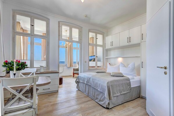 Das komfortable 2-Zimmer-Appartement OG 1 befindet sich im ersten Obergeschoss der Villa Germania nur 40 Meter vom Strand entfernt. Es verfügt über einen Kombiraum mit einem Doppelbett, einem Essbereich und einer integrierten, voll ausgestatteten Küche mit Kaffeemaschine, Wasserkocher, Toaster, Mikrowelle. Das Bad ist mit Dusche und WC ausgestattet. Der Wohnraum mit einer gemütlichen Sitzgruppe befindet sich in der geschlossenen, verglasten Veranda und hier haben Sie einen herrlichen, unverbauten Seeblick. Ein Pkw-Stellplatz steht Ihnen auf dem Grundstück kostenfrei zur Verfügung und Ihre Fahrräder können Sie ebenfalls auf dem Grundstück in einem separaten Abstellraum unterbringen. Alle Wohnungen in der Villa Germania haben passwortgeschütztem DSL-WLAN Internetzugang (gerätegebunden, Euro 1,50 pro Tag und Gerät). Eine Waschmaschine, einen Trockner und den Saunabereich mit Ruheraum können Sie jeweils gern gegen Gebühr nutzen (Münzgeräte).