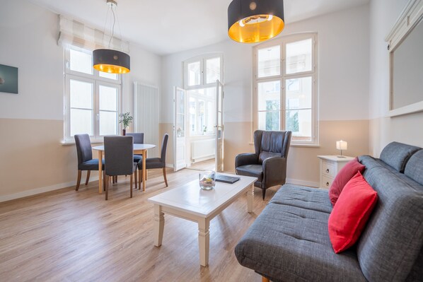 Auf 58 m² finden hier Familien und Freunde ein komfortables Urlaubszuhause. Das Schlafzimmer mit Doppelbett bietet viel Platz, während die Schlafcouch im Wohnbereich für zwei weitere Gäste genutzt werden kann. Eine helle Veranda mit Küchenzeile und Essplatz schafft Raum für gemeinsame Mahlzeiten. Das Bad mit Dusche und WC sowie ein Pkw-Stellplatz am Haus runden das Angebot ab. Die Villa Hartmann-Drewitz reiht sich ein in die schönen Häuser der Klenzestraße im Seebad Heringsdorf. Ihre Strandnahe und vor allem zentrale Lage machen sie so beliebt. Die modernen 2- und 3-Raum-Appartements sind komfortabel ausgestattet und bieten teilweise eine Terrasse, einen Balkon oder verglaste Veranden. Ein Urlaubsdomizil für bis zu 4 Personen und ein Kleinkind. Für jede Wohnung steht ein Pkw-Stellplatz am Haus zur Verfügung. Im Keller steht eine Waschmaschine, die gegen Gebühr zu nutzen ist.