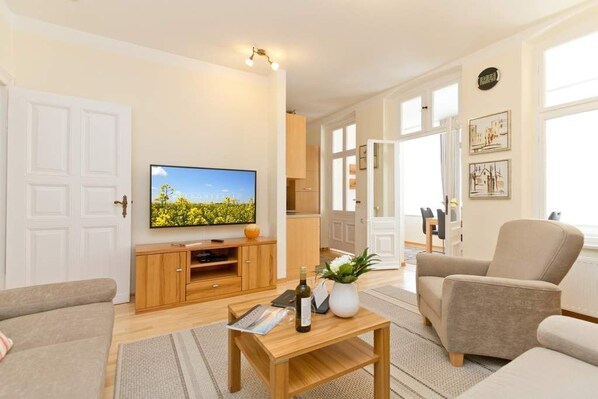Diese schöne 3-Raum-Ferienwohnung im Erdgeschoss ist modern und sehr komfortabel eingerichtet. Die Wohnung bietet Ihnen ein großes Wohnzimmer, eine verglaste Veranda mit Essbereich, eine komplett ausgestattete Küchenzeile, ein Schlafzimmer mit Doppelbett, ein zweites Schlafzimmer mit Schlafcouch (1,50m x 2,00 m). Beide Schlafzimmer sind mit einem Fernseher ausgestattet. Das Bad ist komfortabel mit Dusche, WC, BD, Föhn und Schminkspiegel ausgestattet. Auf Ihrem großzügigen Balkon genießen Sie die Morgensonne.