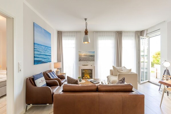 Nordisch nobel, mit einem Hauch von Industriechic präsentiert sich die 77 Quadratmeter große Ferienwohnung Nummer 5 im Erdgeschoss der Villa Westend. Sie empfängt ihre Besucher mit einem offenen und geschmackvoll eingerichteten Wohn- und Essbereich. Der hochwertige Esstisch mit großer Echtholzplatte und die skandinavischen Designstühle fallen dabei sofort ins Auge. Ebenso wie die gemütliche Sitzgruppe, die zum Relaxen vor dem Elektro-Kamin einlädt. Der zaubert egal ob nach einem winterfrischen Strandspaziergang oder einem sonnenreichen Sommerstrandtag mit seinen Flammen herrliches Wohlgefühl in Ihre Urlaubsabende. Per Knopfdruck mit oder ohne Wärme. Industrie-Designlampen setzen im Wohnraum stylische Akzente. Die offene Küche mit hochwertigen Elektrogeräten ist voll ausgestattet. Vom Wohnzimmer aus gelangen Sie auf die Terrasse, wo die Ostsee in nur 50 Metern Entfernung durch die Dünengräser glitzert. Zwei in harmonischen Farben gehaltene Schlafzimmer bieten in Boxspringdoppelbetten (1,80 m x 2,00 m) Platz für 4 Personen. In jedem Zimmer gibt es einen Flat-TV. Viel Platz für die Urlaubsgarderobe bietet je ein Kleiderschrank. In einem großen Wellnessbad, das von einem der beiden Schlafzimmer aus zugänglich ist, lässt es sich in der finnischen Sauna, der Badewanne oder unter der Regendusche wunderbar entspannen. Ein zweites Bad ist ebenfalls mit Dusche, WC und Waschtisch ausgestattet. Für den puren Urlaubsgenuss liegen Handtücher für Sie bereit und die Betten sind frisch bezogen. Es steht Ihnen ein Pkw-Stellplatz in der Tiefgarage zur Verfügung.