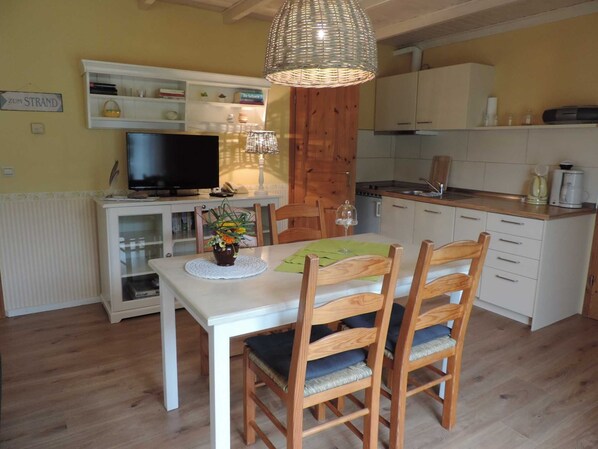 Diese Ferienwohnung befindet sich im Erdgeschoß auf der Südseite des Hauses und ist flächenmäßig mit ca. 40 m² die größte Wohnung. Sie ist aufgeteilt in einen Schlafraum, Wohnraum mit Küchenzeile und Bad mit Dusche und WC. Das Doppelbett im Schlafzimmer hat eine Größe von 1,60m x 2,00m. Im Wohnzimmer steht, falls eine Aufbettung gewünscht wird eine Doppelbettcouch. Zur Wohnzimmerausstattung gehören außerdem W-LAN, ein Fernseher, Radio mit CD-Player. Die Küche hat folgende Ausstattung, Cerankochfeld, Kühlschrank mit kleinem Gefrierfach, Geschirrspüler, Kaffeeautomat, Wasserkocher, Toaster sowie div. Geschirr und Küchenutensilien.