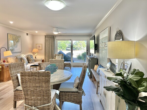 We know you are going to love the ease of access with this first-floor walk-up. Enjoy the private patio for a relaxing meal, keeping your bikes and beach gear right outside or walking right around to your car. No stairs! The large sliding doors allow the sun to shine into the living room all day. There is plenty of seating in the living area and the dining room seats four comfortably. You will find everything you need in this immaculately remodeled and fully-equipped kitchen with an efficient layout and plenty of counter space. Coffee lovers will especially like the option to use either the Keurig or the drip coffee maker - m-m-m, who doesn't love the smell of coffee in the morning?