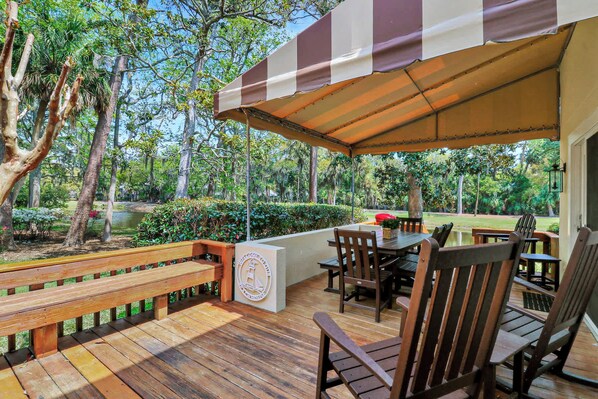 Step onto the private covered deck to soak in the picturesque lagoon and golf course views. Fire up the electric grill for a delicious BBQ and enjoy alfresco dining at the patio table. Relax with a book in a comfortable lounger as you take in the peaceful surroundings.