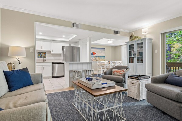 Escape to 1662 Bluff Villa, a beautifully updated 2-bedroom, 2-bathroom villa located in the heart of Sea Pines Resort, just steps from South Beach Marina and a short 5-minute stroll to the beach. Perfect for families and small groups, this villa comfortably sleeps up to 6 guests with 1 king bed, 2 twin beds, and a sleeper sofa in the living room.