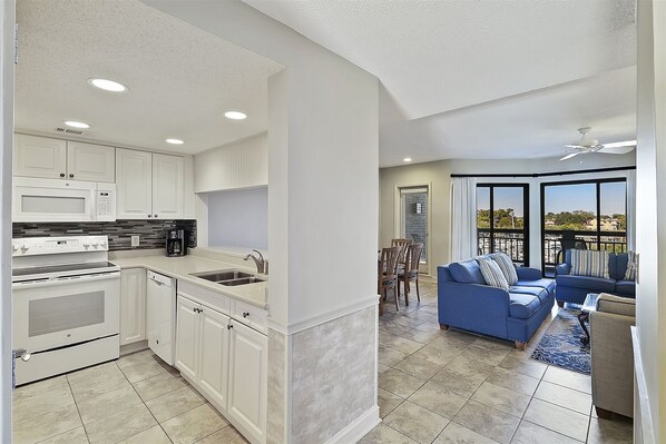 This spacious 3 Bedroom Harboview Villa has everything needed for a perfect island retreat.   Large living area, 3 comfortable bedrooms with private baths and a fully equipped kitchen.  Best of all, the view!  Enjoy all of the beauty of Shelter Cove from the balcony with seating for six.  Direct view of fireworks on Tuesday nights in the summer!