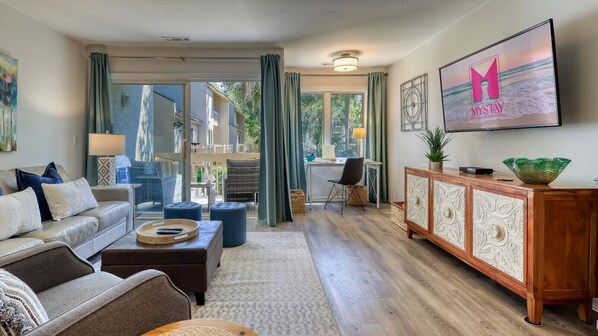 Let’s talk about the vibes: the main level is where the magic begins, featuring an open, updated space that blends relaxation and functionality. You’ll find a fully equipped kitchen (yes, there’s a full-size washer/dryer because who wants to lug sandy clothes home?), a cozy living area with a large SmartTV perfect for binge-watching after a day at the beach, and even a desk for those totally optional work emails. There’s also a half bath on this level because, honestly, convenience is king. Step out onto the balcony overlooking a serene courtyard—it’s the perfect spot for morning coffee, evening wine, or anytime dog-watching.