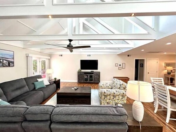 Your gorgeous high-end chef's kitchen features new appliances, stone countertops as well as breakfast seating which overlooks the dining table, great for family meals or game nights. Step into the light and airy living room with oversized automatic reclining sectional sofa great for reading or catching a movie on the smart TV plus cable. Also within the living area is a desk space for your remote work needs.