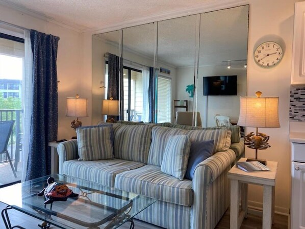 The spacious one bedroom, one bath villa that can sleep 4 people is located on the second floor of Ocean Villa A building. The villa has a fully equipped kitchen/dining area with a queen sleeper sofa. The master bedroom is furnished with a queen size bed. Enjoy your morning coffee on the balcony then venture out to the beach, pool or tennis courts that are only steps away!!
