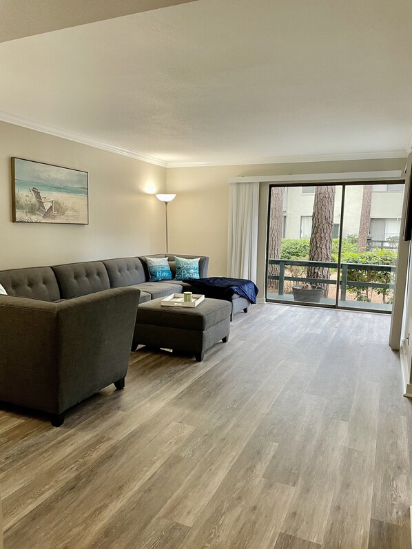 Come to the heart of HHI and enjoy our families 1600+ square ft. fully-remodeled & cared for condo. We are located within Shipyard, which is full of beautiful bike paths, 3 golf courses, tennis courts, a private beach for owners & guests only, a large pool overlooking the golf course (did I mention this is 100 steps from our front door?), right at the most convenient corner of the whole island. Like to bike? Us, too! You can bike to the beach in 12 minutes (or drive in 4, all within the neighborhood). Bike or walk to dinner as over 40 restaurants are 2 miles away (or less)! Our kids favorite part of the island is all of the wildlife… See sights of alligators, turtles, birds, and deer on your morning walk! Enjoy our back porch with new & comfortable patio furniture. There is lots of room out back for the kids to run around. Our kitchen is fully-stocked & opens up to the eating area. The living room holds large families on the XL couch for movie nights. Our den has a daybed that sleeps 2 on separate twin beds. Upstairs, you’ll find 3 large bedrooms and 2 full baths, all expertly remodeled. Every single room with a bed in the home has its own smart TV with YOUTUBETV and it is loaded with all the apps you could want. This includes the den, which is great for the little ones to enjoy their own time! The master bedroom has a king sized bed with plenty of room to spread out. Traveling with a baby? Remember, that infant doesn’t count in the max guests AND the master closet is tucked away & more than large enough for a private pack & play area (that we provide, as well as a high chair)! The 2nd bedroom has a queen bed as well as a desk/workspace with speedy WiFi throughout the home. The 3rd bedroom has a twin over full bunk bed. There are a few toys in this room as well as a basketball hoop. Find a cabinet downstairs full of board games. We also provide beach towels, boogie boards & beach toys, a backpack cooler, beach bag, and loads of recommendations for a fun week at the beach! Bike rental options are endless on the island & they deliver bikes to/from your front door. We have a large private front porch to store your bikes at night. We take pride in hosting and look forward to chatting soon!