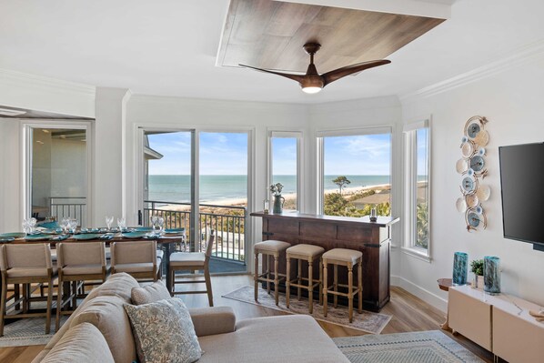The location of our stunning 4 bedroom/3 bathroom beachfront penthouse Sea Crest #2512 condo is outstanding as it’s in the heart of Coligny Plaza where you can walk to shops, restaurants and beach bars. In fact the island’s famous Pool Bar Jim’s Beachside Grill where frozen drinks are made with fresh fruit is located in Sea Crest and the iconic Tiki Hut which has an abundance of free live entertainment is a mere 5 minute stroll away. The beautiful Lowcountry Celebration Park is also a short walk away. Our villa overlooks our complexes beautiful lagoons and pool as well as the ocean and is truly breathtaking. You'll enjoy these views from two spacious balconies as well as the living room and two master bedrooms.