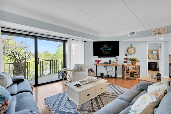 Upon arrival, the complex has complimentary bellman carts in the covered garage and elevator access making getting your luggage to the third floor a breeze! Inside the villa, you are greeted by an open floor plan living/dining area that is centrally located between bedrooms, providing guests additional privacy. The living room features comfortable seating and a smart TV. Guests also have access to a spacious balcony overlooking Lowcountry Celebration Park. The dining table comfortably fits all guests and the gourmet kitchen is fully stocked with everything you need to prepare meals during your stay. Be sure to take a look at the beautiful butcher block countertops with unique coastal veining throughout! A washer and dryer are also available for guest use.