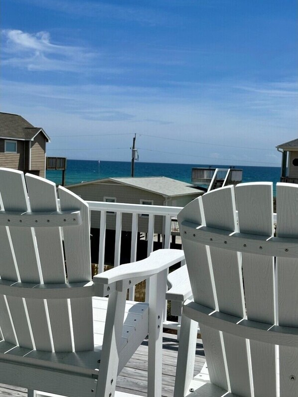 Nestled in the vibrant heart of Surf City, this stunning single-family residence is mere steps from beach access, providing an ideal combination of breathtaking ocean vistas from the rear deck and captivating sunset scenes from the front porch. Accommodating parking for six vehicles is available, including an EV Charger for environmentally conscious visitors. Enter into the spacious open-concept living area, featuring comfortable new furnishings such as a Queen Sleeper Sofa and a flat-screen TV for everyone's entertainment. The contemporary kitchen, equipped with stainless steel appliances, is fully stocked to meet all your culinary needs. This sea-facing kitchen boasts a generous farmhouse table and bar stools, perfect for dining or game nights, along with a balcony to savor your morning coffee. Adjacent to the kitchen, there is a washer and dryer, followed by the Master Bedroom Suite that includes a King-size bed, views of the ocean, and direct access to the deck. A TV with streaming capabilities is available should you wish to take a break from the ocean views—just for fun! The second bedroom on the main level features a Queen bed and a Roku TV. Ascend the stairs to discover an ocean-view bedroom with two Twin over Full bunk beds, while the front of the house hosts another bedroom with a King bed and a Roku TV. The backyard is equipped with a new picnic table and yard games, ensuring family fun before relaxing in the 5-person hot tub to end your evening! Additional amenities of this property include an EV Charging Station. You'll also find a variety of local activities nearby such as kayaking, stand-up paddleboarding, bike rentals, the Turtle Hospital, and a playground.