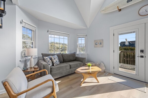 The attached deck off the living area invites you to relax and unwind with ocean views as your backdrop. Whether you're enjoying a quiet morning coffee as the sun rises over the water or gathering with friends for an evening cocktail, the deck offers a front-row seat to the sights, sounds, and salty breeze of the sea. Just steps away, direct beach access across the street makes it effortless to dip your toes in the sand or take a morning stroll along the shoreline. For your convenience, beach chairs and a wagon are provided, so you can easily pack up your essentials for a perfect day by the water.