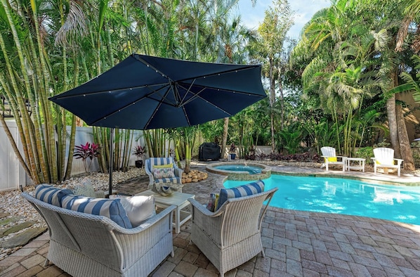 This house was perfect for our family Spring Break vacation. It is walking distance to the beach, plenty of shopping and restaurants, and the boat ramp. The heated pool and hot tub were fabulous day and evening. The beds are comfortable and the overall house is very clean and well cared for. The kitchen was stocked full of any cooking item you could need. The three patios are perfect for having morning coffee or enjoying the evening sunset. We ate many meals on the dinning patio overlooking the pool. The house manager was very attentive when we needed the propane tank swapped out for the gas grill. We will be back!