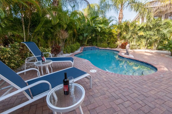 Enjoy outdoor life in your lush backyard featuring a private pool with a sun shelf, perfect for relaxing after sunbathing or swimming in the ocean. Dine at the outdoor table with a BBQ grill and enjoy the tropical surroundings. Step outside, hop on the trolley, or rent a golf cart for island exploring. Walk to nearby beaches, shops, and waterfront restaurants for the full Anna Maria experience.