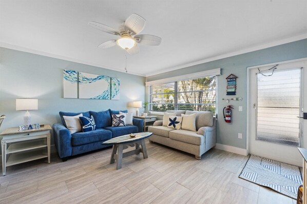 The Lazy Lizard is a ground floor home with 2 bedrooms (one with a queen and one with two twins), a full-size pull-out sofa, and a screened-in lanai with private access off the Master bedroom (perfect for your morning coffee, quiet dinners, or an evening cocktail). The cottage is newly renovated with a brand-new kitchen, quartz counters, stainless steel appliances, and new tile flooring throughout. The tranquil coastal décor provides a relaxing space for the whole family. Beach chairs, wagons, umbrella, toys, and games are available for your use.