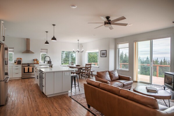 Welcome to this spacious 2,300 sq ft retreat designed for comfort, connection, and unforgettable views. The main level features an open living area with leather seating and large windows that frame Cook Inlet and the surrounding mountains. The chef’s kitchen, dining area, and a generous deck flow seamlessly together, creating the perfect space to gather, cook, and take in the scenery.