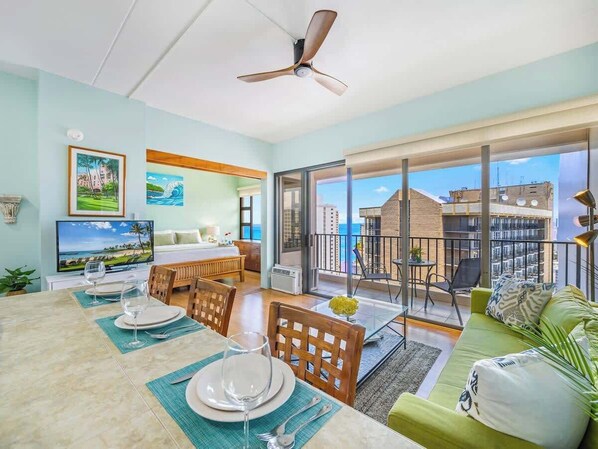 For your convenience and comfort, this air-conditioned unit has an open floor plan and a fully equipped kitchen, along with a countertop for up to 3 people. The bedroom has a king-size bed, while the living room area with pull-out sleeper sofa, ceiling fan, and a 40" Smart TV. To top it all off, the condo features a full bathroom with a walk-in shower.