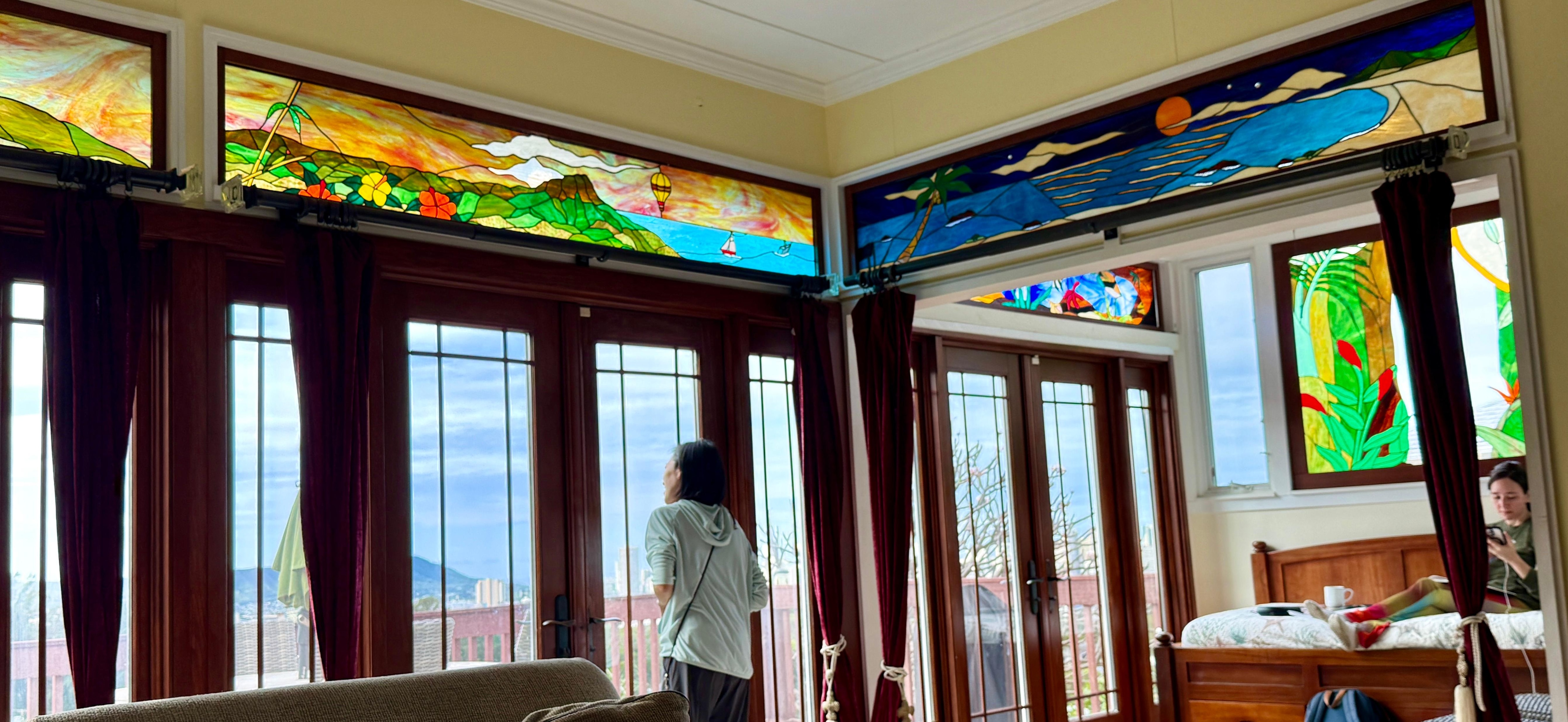 Drei können an der Frühstücksbar sitzen und ein formeller Essbereich bietet Platz für sechs Personen für ein gemeinsames Fest. Aufwendig bemalte Glasfenster laden Farbe und Licht in diesen Bereich ein.