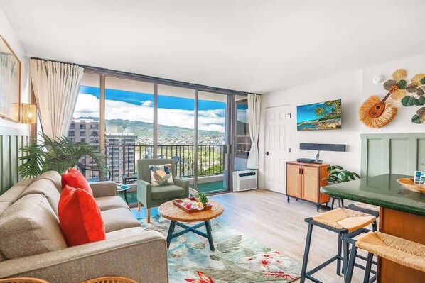 Experience a memorable Hawaiian getaway in this 600 sq ft 1-bedroom condo at Waikiki Banyan (Tower 2 - Mauka), perfectly located in the heart of Waikiki. Enjoy stunning mountain and city views from the 16th floor, unwind in the king bedroom, or relax in the tub/shower combo bathroom, and prepare meals in the fully equipped kitchen. The living area features a 40" Smart TV and a pull-out sleeper sofa. Free parking, high-speed Wi-Fi, linens, towels, and beach towels are included, with laundry facilities on every floor!