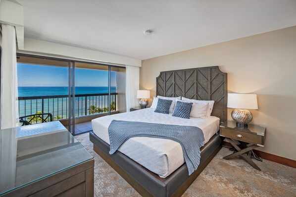 Our condominium offers a world class ocean view, full-size kitchen, private lanai, and a washer & dryer in the condo. The bedding is convenient with a king bed in the master bedroom, two twin beds in the second bedroom, and full sofa sleeper in the living room.