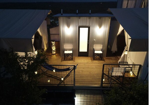 Located on a private deck on the second floor of our Glampominium - The Twins – two safari tents perched above Horseshoe bay with incredible views of the sunset / night sky over the lake. One luxury tent includes a king-size bed, AC/heat, mini-fridge, microwave, and coffee maker. The second tent includes two queen size beds, AC/heat, and a mini-fridge. The Twins can sleep up to 6 guests and has a large deck with a private bathroom, indoor and outdoor shower, seating, and hammock.