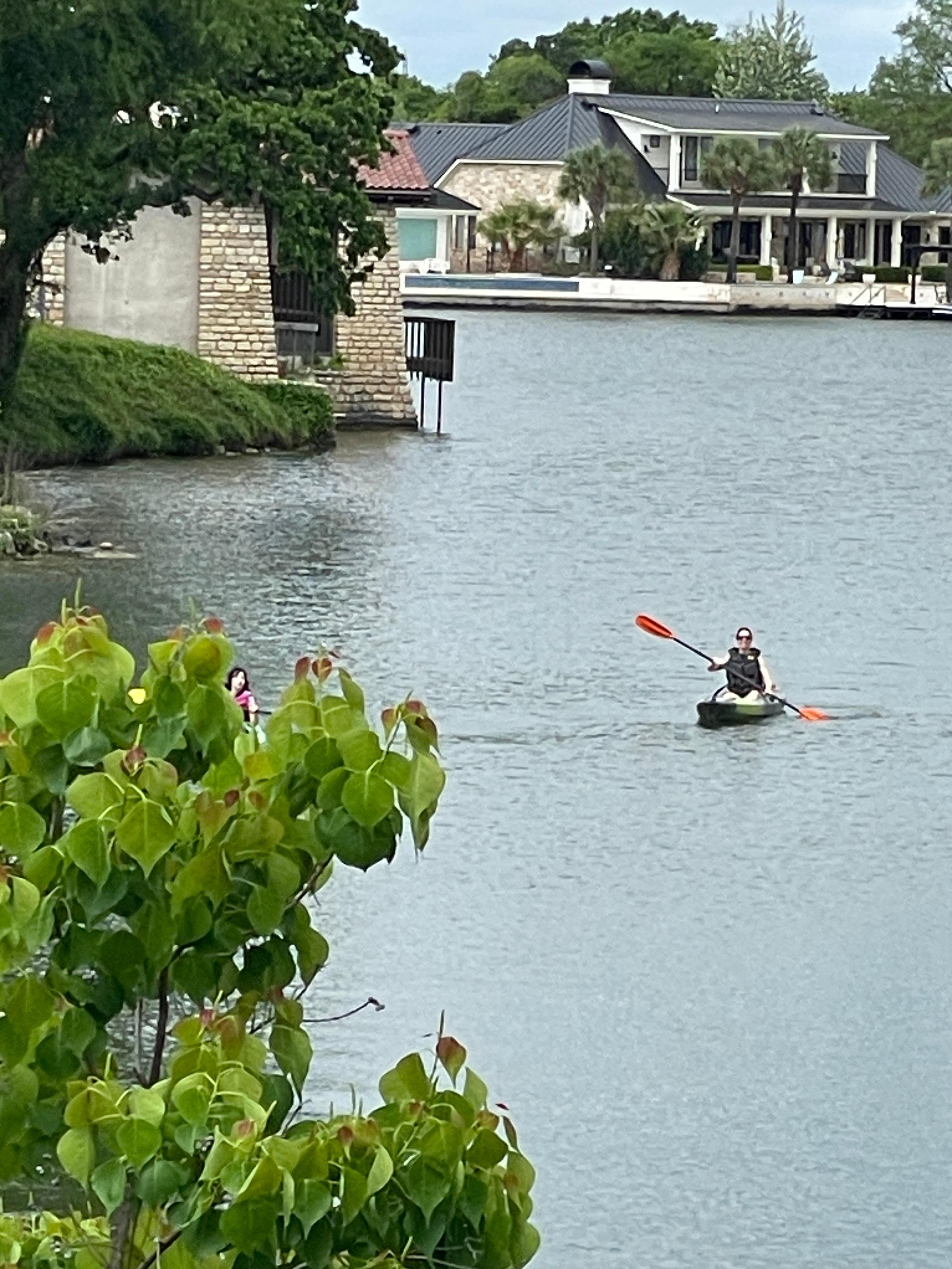 Outside is a large covered patio with a BBQ grill, a wood deck (perfect for yoga), and a huge raised deck above the jet ski ramp with amazing lake views. The is a pool and hot tub for relaxing. There are 3 kayaks and 2 paddleboards available for use. Life jackets are required on the lake, a few are provided. We suggest you bring your own life jackets, especially for children. The slip is available for 2 jet skis. Because we are at the end of the cove, the water is about 3 feet deep and not great for swimming. Just 200 feet and you have unlimited swimming in the main lake. There are jet ski rentals nearby. It is against HOA Rules to park trailers at the house. Trailer parking is available at LBJ Yacht Club for $15 a night, a 5-minute drive from the home.