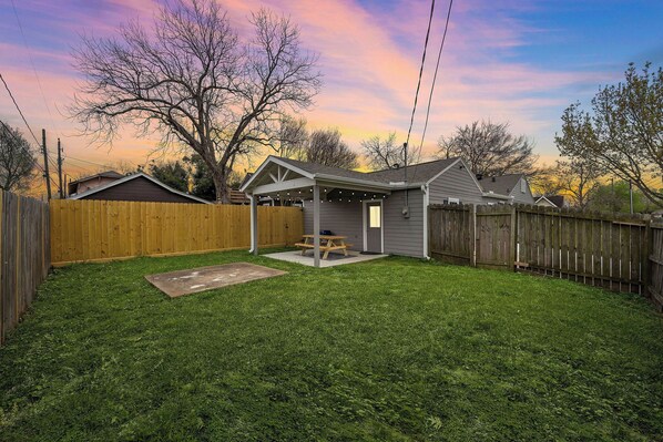 Your charming studio awaits! Queen bed, sleeper sofa, private bathroom, shared laundry. Step outside to your own backyard & covered patio.